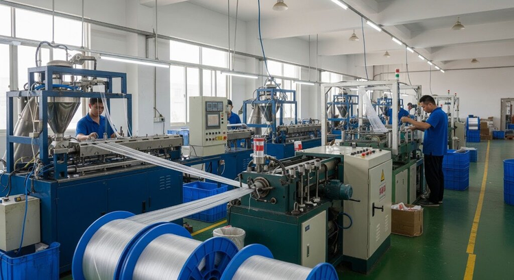 Основа производства полипропиленовой лески — экструзионная линия. В нее входят экструдер с системой нагрева, ванна для охлаждения, узлы стабилизации и растяжения, устройство кручения и намотчик готовой продукции. Для повышения эффективности используют дополнительное оборудование: бункер-сушилку для подготовки гранулята, вакуумный загрузчик, чиллер для охлаждения, компрессор и дробилку для отходов.