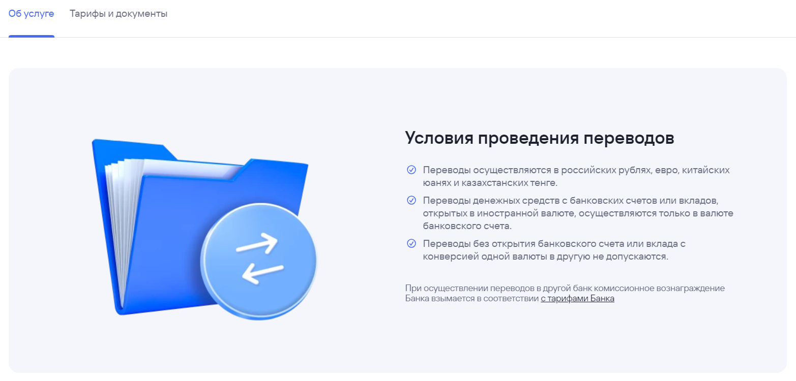 Минимальная сумма перевода — 20 000 €. Комиссия — 3% от суммы перевода (минимальная — 30 000 ₽, максимальная — 60 000 ₽), для VIP-клиентов — 1% от суммы перевода. Банк может потребовать документы, подтверждающие происхождение денежных средств — обычно при переводе суммы в эквиваленте свыше 5 000 $.