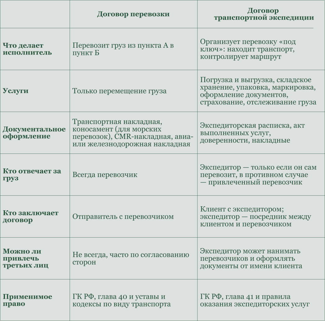В чем разница между договором перевозки и договором транспортной экспедиции