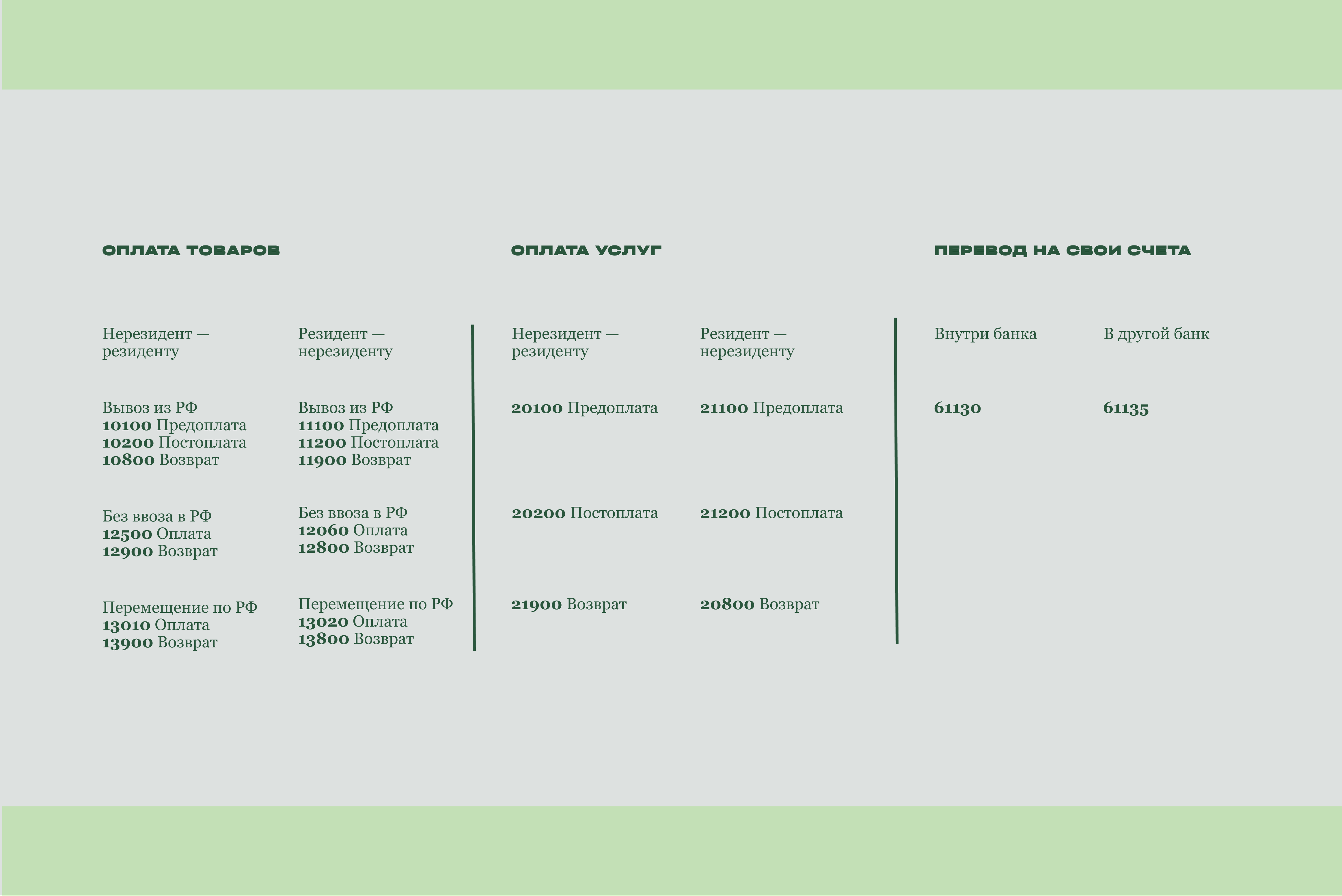 Инструкции Центробанка РФдают разъяснения по применению законодательства и устанавливают требования к банкам по осуществлению валютного контроля. Например, Центробанк регулярно публикует информацию об актуальных кодах валютных операций, которые необходимо указывать в платежных поручениях.
