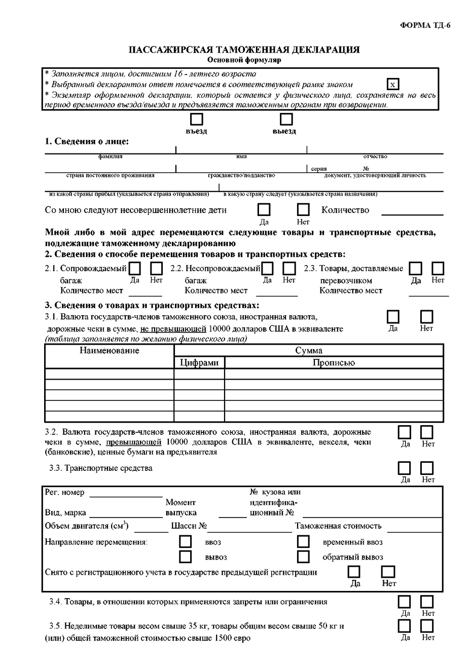Нужно будет заполнить пассажирскую таможенную декларацию (форма ТД-6): в ней указываются ваши личные данные (ФИО, паспортные данные, адрес), цель ввоза автомобиля и информация о машине — марка, модель, VIN-номер (от англ. vehicle identification number — идентификационный номер транспортного средства), год выпуска и т. д.