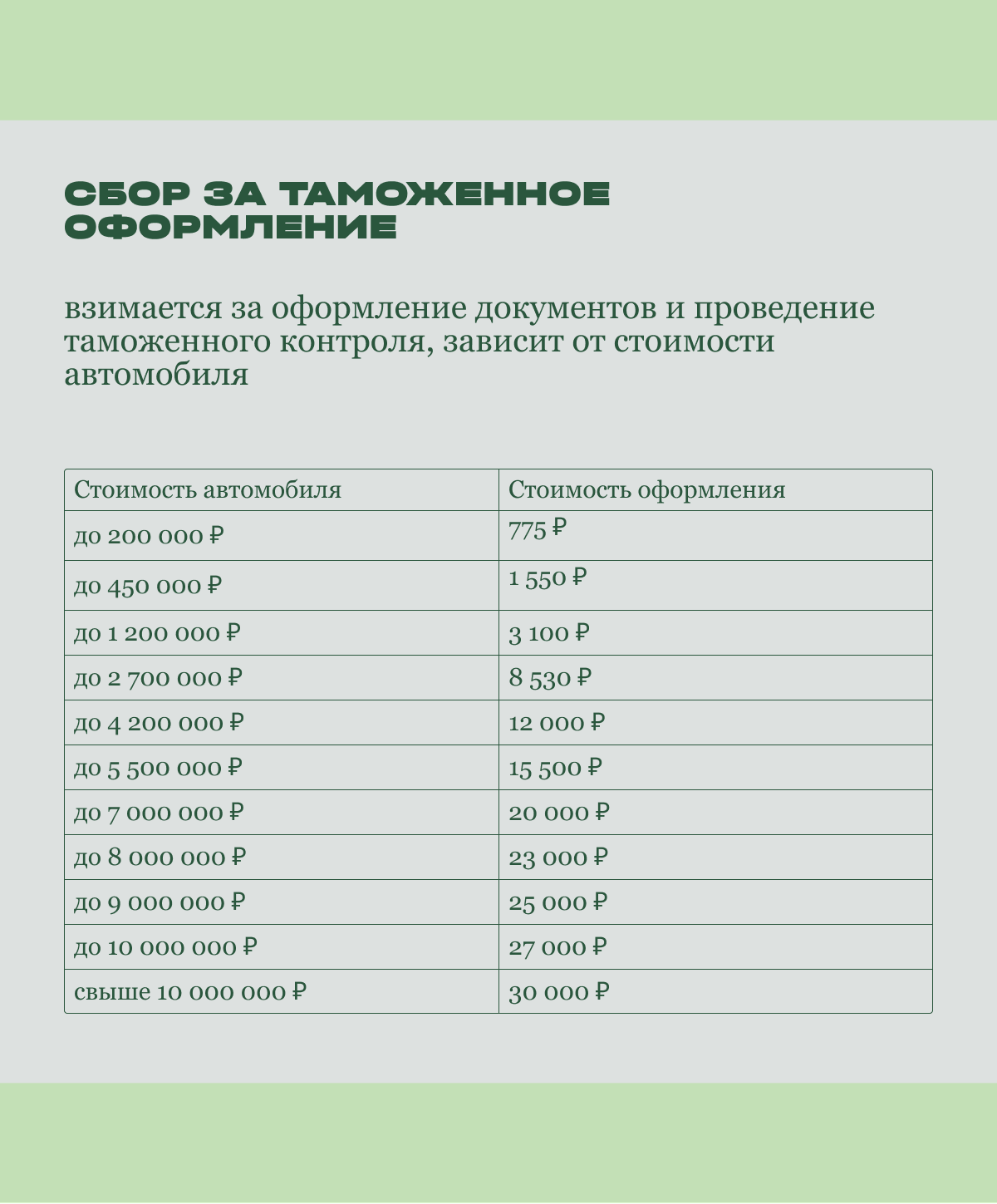 Сбор за таможенное оформление для юридического лица автомобиля стоимостью до 10 000 000 ₽ — 12 000 ₽.