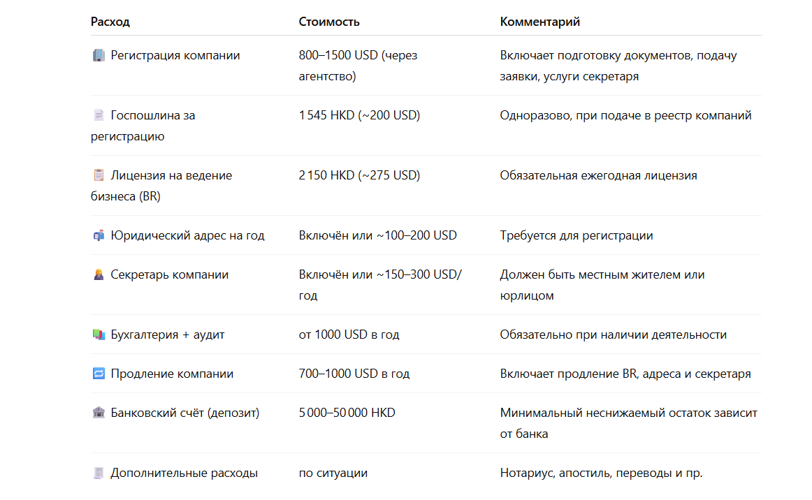 Госпошлины. Сюда входят регистрационный сбор 1 545 HKD (~200 $) и сбор за получение бизнес-лицензии — 2 150 HKD (~275 $). Суммы могут меняться в зависимости от законодательства и типа компании.