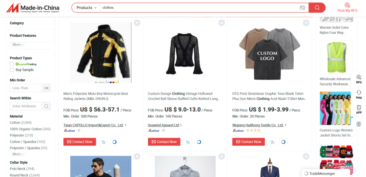 Made-in-China.com менее известна в России, но ориентирована площадка именно на зарубежных покупателей. Это вторая по величине B2B платформа в мире после Alibaba, она подходит для поиска оптовых поставщиков одежды благодаря строгой системе верификации и широкому выбору производителей (более 500 000 компаний). Общение можно вести на русском или английском. Для защиты платежей покупатели могут воспользоваться системой Trade Assurance.