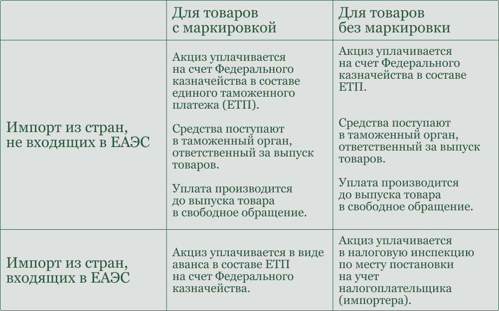 Порядок уплаты акциза зависит от страны происхождения товара (ЕАЭС или другие страны), а также от того, подлежит ли товар обязательной маркировке.