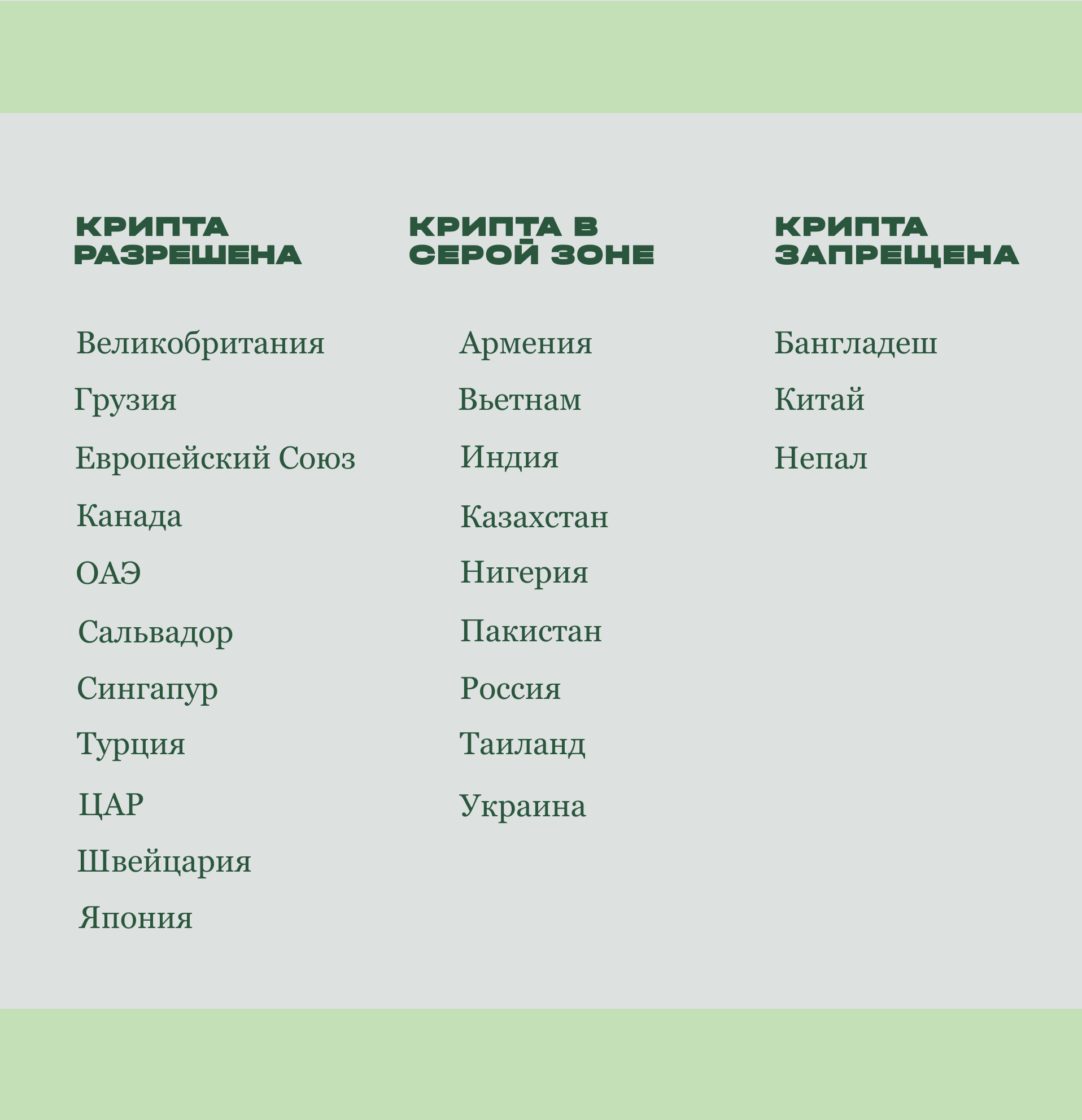 Регуляторы не сразу обратили внимание на биткоин, но сейчас, когда он все активнее встраивается в мировую экономику, многие страны начали разрабатывать криптозаконы, чтобы предотвратить отмывание денег и другие незаконные операции. В одних странах криптовалюта уже легальна, в других — пока еще существует в «серой» зоне или вовсе запрещена.