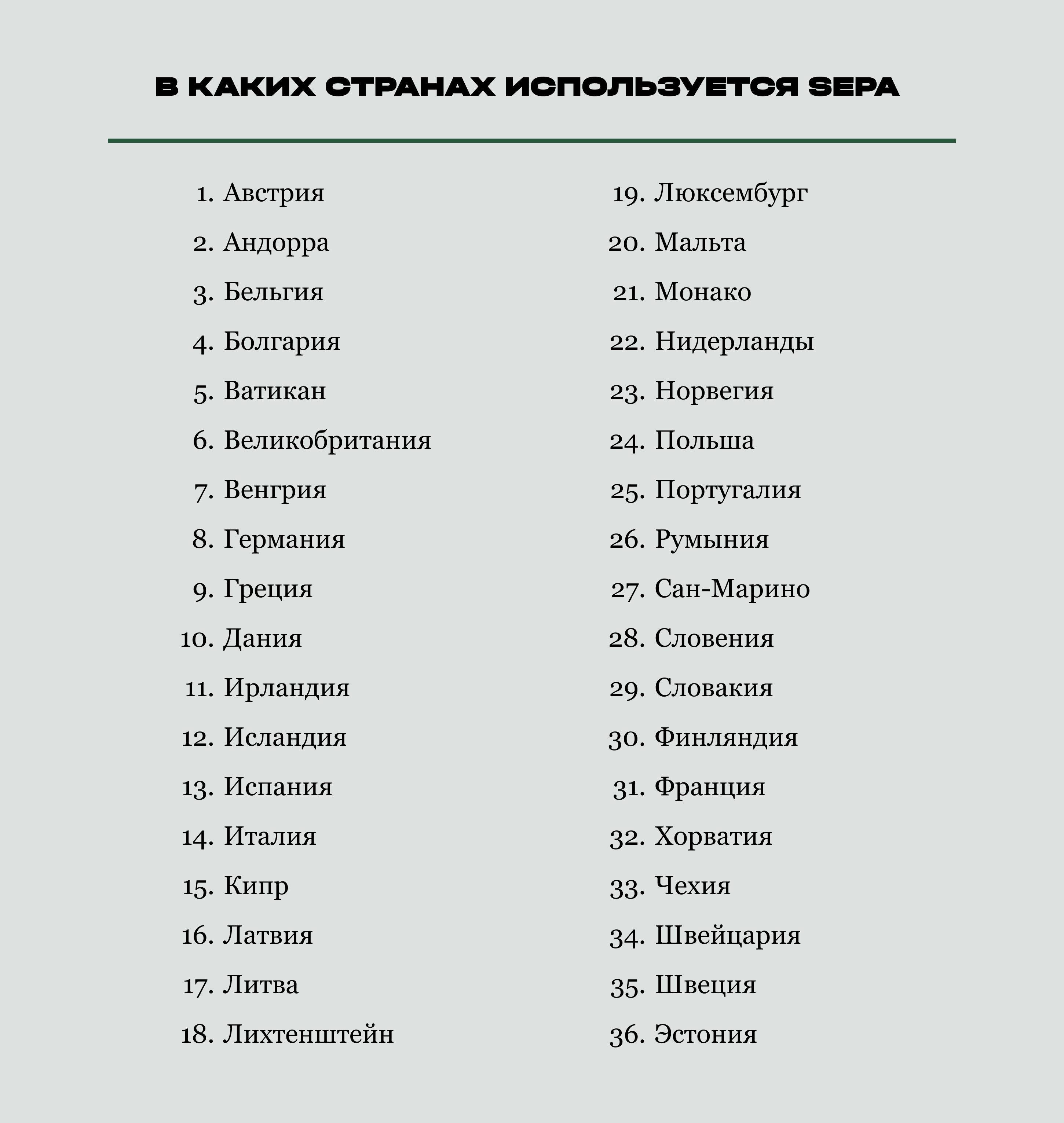 В Европе существует пусть не такая масштабная, но все же удобная альтернатива привычным нам SWIFT-переводам: платежная система SEPA объединяет 36 стран и упрощает денежные переводы внутри этой зоны.