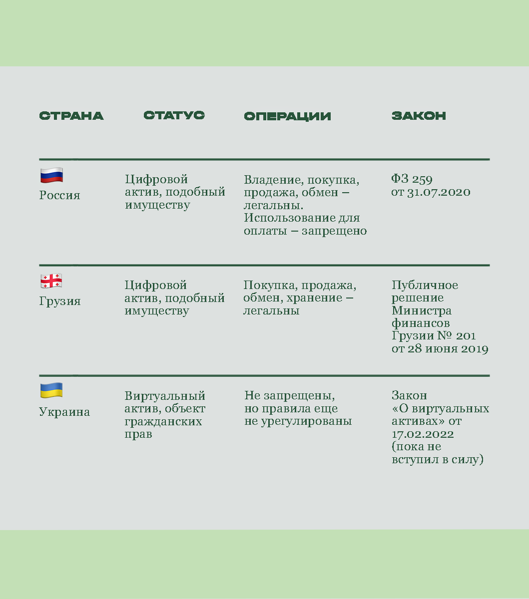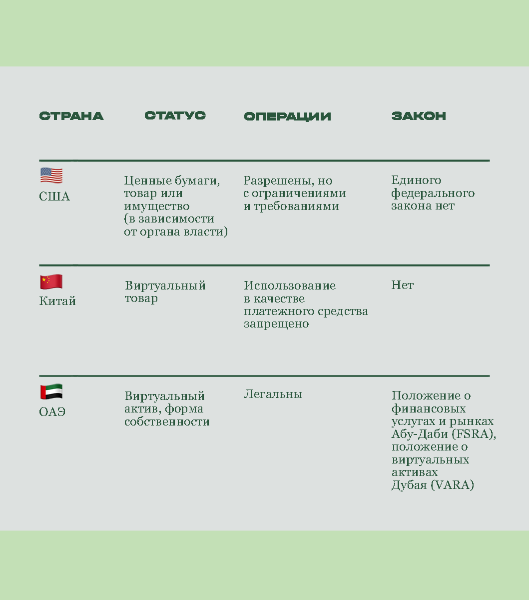 Евросоюз утвердил комплексное регулирование криптовалют (MiCA), которое должно унифицировать правила на территории ЕС. Китай ввел запрет на криптовалютные операции, включая майнинг и торговлю, а в Сальвадоре, например, биткоин признан официальным платежным средством — наряду с долларом США.