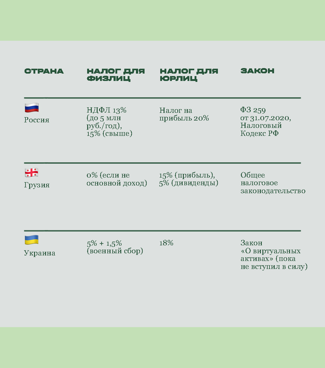 Налоговые правила по всему миру разнятся: например, в Японии криптовалюта облагается налогом на прирост капитала по прогрессивной ставке до 55%, а в Германии за прирост капитала не нужно платить, если крипта хранится более года. В некоторых странах налогообложение криптовалют пока еще слабо регулируется, но, несмотря на отсутствие четких правил, рекомендуется декларировать доходы от операций с криптой — и консультироваться со специалистами, потому что законы постоянно меняются.